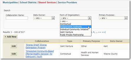 The Directory includes an option to search the entire database of Shared Services. This feature is helpful when looking for collaboration examples and ideas. For more information about switching modules see, Switching Modules.