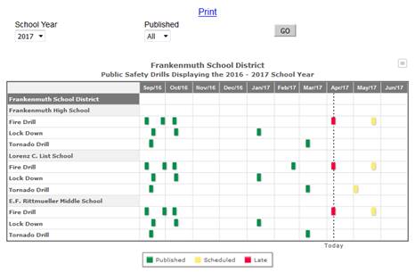 The Schedule Timeline chart is an important report to get an overall picture of drill compliance. The vertical dashed line represents today. Anything to the right of today is scheduled and will appear in yellow. Anything to the left of today is in the past and should be green. Any drill in red is a drill that is in the past but is not appearing on the public report.